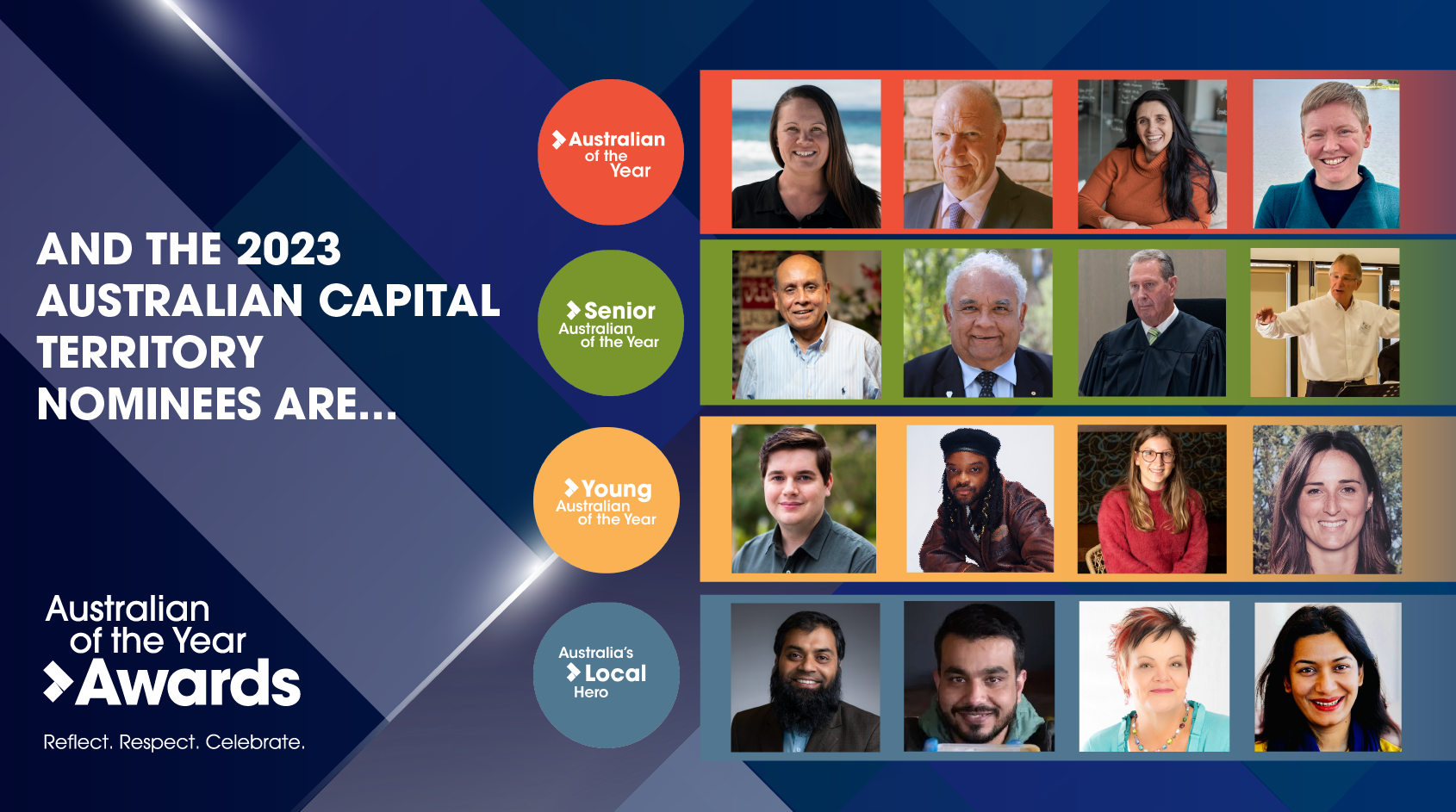 They are just some of the 16 people in the running to be named the ACT Australian of the Year, ACT Senior Australian of the Year, ACT Young Australian of the Year and ACT Local Hero.